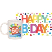 Verjaardag cadeau mok/beker 60 jaar print 300 ml + A5-size wenskaart Happy Birthday. Leuke koffiemok om als cadeau te geven. Tevens in deze set een Gefeliciteerd verjaardagskaart / ansichtkaart…