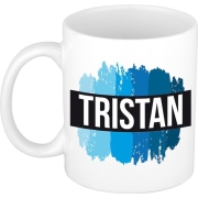 Naam cadeau mok / beker Tristan met verfstrepen, 300 ml. Dit leuke voornaam cadeau / gadget koffiemok / theebeker met verfstrepen in verschillende kleuren blauw is voor iemand met de voornaam…