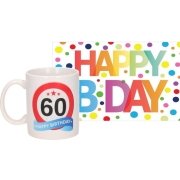 Verjaardag cadeau mok/beker 60 jaar print 300 ml + A5-size wenskaart Happy Birthday. Leuke koffiemok om als cadeau te geven. Tevens in deze set een Gefeliciteerd verjaardagskaart / ansichtkaart…