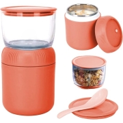To-Go Mueslibeker 430 ml + 330 ml yoghurtbeker om mee te nemen, lekvrij, 2-in-1 lunchbox met lepel voor verse maaltijden, kinderen, snackpot voor onderweg (oranje, rood, roestvrij staal)
