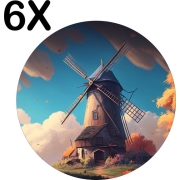 BWK Luxe Ronde Placemat - Tekening van een Molen in de Herfst - Set van 6 Placemats - 40x40 cm - 2 mm dik Vinyl - Anti Slip - Afneembaar