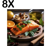 BWK Textiele Placemat - Zalm met Noten op Houten Bord - Set van 8 Placemats - 40x40 cm - Polyester Stof - Afneembaar