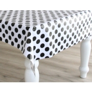 Tafeldecoratie zeil met wit met grote zwarte polkadot stippen print. Afmeting: 140 x 180 cm. Het tafelzeil valt het mooiste rondom een tafel van 100 x 140 cm, zorg bij een grotere tafel voor een…