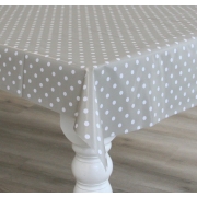 Tafeldecoratie zeil met grijs met witte polkadot stippen print. Afmeting: 140 x 180 cm. Het tafelzeil valt het mooiste rondom een tafel van 100 x 140 cm, zorg bij een grotere tafel voor een…