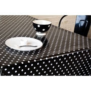 Tafeldecoratie zeil in wit met zwarte polkadots stippen print. Afmeting: 140 x 175 cm. Het tafelzeil valt het mooiste rondom een tafel van 100 x 140 cm, zorg bij een grotere tafel voor een…