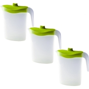 3x waterkan/sapkan/schenkkan met groen deksel en een inhoud van 2,5 liter, gemnaakt van stevig kunststof. Transparante kan met hengsel, schenktuit en een afsluitbare deksel. Materiaal: plastic/…