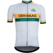Maak nu je kilometers (door de Haagse duinen) in dit mooie Den Haag fietsshirt! Mooi retro look fietsshirt met het Haagse Vrede en Recht logo en de Haagse ooievaar. <br />
