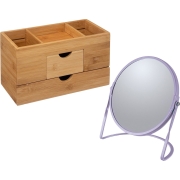 Make-up organizer met 2 lades en 3 vakjes in de kleur lichtbruin samen met een ronde opmaak spiegel met 5x zoom in de kleur paars. De rechthoekige bamboe organizer heeft kleine en grotere vakjes…
