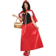 Dit roodkapje kostuum voor vrouwen bestaat uit een jurk en een cape. (Mandje en schoenen niet inbegrepen.) De rode jurk is gemaakt van satijnachtig stof en is lang. Het heeft een zwart imitatiekorset…