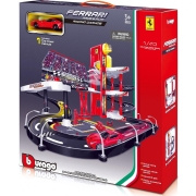 Schaalmodel van Bburago van de RACE & PLAY THREE-LEVEL RACING GARAGE + 1 FERRARI F12 in de schaal 1:43 en kleur rood.…