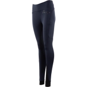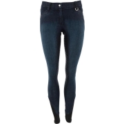 Strak model denim damesrijbroek met een ¾ stoffen zitvlak met siliconenprint. De rijbroek is voorzien van twee jeanszakken aan de voorkant en twee opgestikte zakken aan de achterkant. De imitatie…
