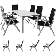 Exclusieve 7-delige aluminium tuinset Bern met tafelblad van hoogwaardig veiligheidsglas, inklapbare stoelen met hoge rugleuning die in 8 standen verstelbaar is. Deze elegante aluminium zitgroep…