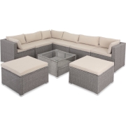 Mooie poly rotan hoekbank set voor in je tuin! De hoekbank bestaat uit 2 grote zitelementen (175 + 165 cm), 6 afneembare kussens, 7 rugkussens en een tafel. Nieuw! Tafel gemaakt van WPC materiaal (…