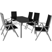 Exclusief, 7-delig. Aluminium tuinset met tafelblad van hoogwaardig veiligheidsglas, klapstoelen met hoge rugleuningen, verstelbaar in 8 standen. Deze elegante aluminium ztigroep bestaat uit 1 tafel…