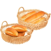 2x broodmandje met hengsels, gemaakt van gevlochten wilgen tak, in de kleur lichtbruin. Vorm: rond. Afmetingen: D36 x H14 cm. Ideaal voor het presenteren van vers afgebakken broodjes of sneetjes…