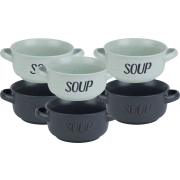 Een set met 6x soepbekers/soepkommen, in een mix van 2 kleuren(groen en donkergrijs). Van elke kleur 3x stuks. Op elke soepkom staat de tekst Soup. Met oren, zodat u de hete kom goed kunt…