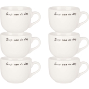 Een set met 6x soepbekers/soepkommen, in een mix van kleuren. Op elke soepkom staat de tekst Soup. Met oren, zodat u de hete kom goed kunt vastpakken. Afmeting: ca. D11 x H8,5 cm. Inhoud: ca. 510…