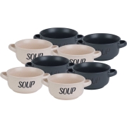 Een set met 8x soepbekers/soepkommen, in een mix van 2 kleuren(creme wit en donkergrijs). Van elke kleur 4x stuks. Op elke soepkom staat de tekst Soup. Met oren, zodat u de hete kom goed kunt…