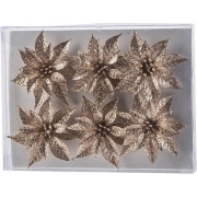 6x Kerstboomversiering champagne glitter bloemen op clip - kerstboom decoratie - champagne kerstversieringen