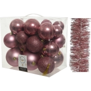 Kerstversiering kunststof kerstballen 6-8-10 cm met folieslingers pakket oud roze van 28x stuks -
