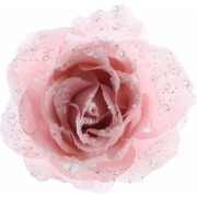 Kerst decoratie roos poeder roze 14 cm. De kerstroos op clip is bezaaid met glitters. De bloem is te gebruiken in kerststukje, of als aanvulling van uw kerstboom of zelfs als piek. Diameter:…
