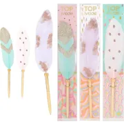 Betoverend mooi schrijven! De TOPModel pen met grote veer is er in drie verschillende designs: gouden pen met paarse veer en gouden glitter, roze pen met roze veer met glitter en gouden met turquoise…