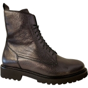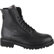 Veterboot van Durea in zwart leer met op de hiel printleer en een gewatteerd gestikt ruitmotief aan de bovenzijde van de schacht. De laars, geïnspireerd door de hikingboot, heeft naast een gemeleerde…