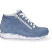 Sneaker van Durea in jeansblauw suède en printsuède op een off-white rubberzool met grijs loopvlak. Artikel 6260 685 0893 heeft naast een wit gemeleerde ronde veter een zilverkleurige rits aan de…