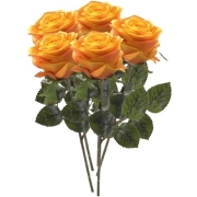 Kunstbloem roos Simone in de kleur geel/oranje. Deze roos heeft 1 mooie volle roos met ca. 5 bladeren. De bloem heeft een doorsnee van ca. 5 cm. Zet meerder bloemen in een vaas als mooie decoratie…