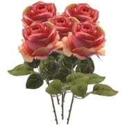 5x kunstbloem roos Pascal in de kleur roze/oranje. Deze roos heeft 1 mooie volle roos met 2 sets bladeren van ca. 8 stuks. De bloem heeft een doorsnee van ca. 13 cm. Zet meerder bloemen in een…