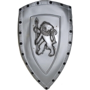Dit schild is gemaakt van plastic en is ongeveer 42 cm breed en 72 cm hoog. Het is grijs van kleur en heeft een leeuw erop afgebeeld met een speer in de klauw. Het schild zal ideaal zijn voor het…