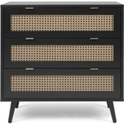 Ladekast Daka in zwart en een geprint decor van natuurkleurig gevlochten lades, gemaakt uit spaanplaat en MDF. Uitgerust met 3 lades. Dit betreft geen echt vlechtwerk. …
