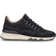 Uit de collectie van het Nederlandse merk Floris van Bommel is deze donkerblauwe lage sneaker SFM-10135 van zijdezacht suède. Het bovenwerk heeft een sportieve belijningen, een dubbele tong met zwart…