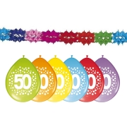 Verjaardag feest 50 jaar geworden versieringen basic pakket bestaande uit ballonnen en slingers. In deze feest set: 3x gekleurde feestslinger van papier 6 meter en 32x stuks gekleurde latex feest/…