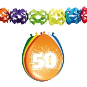 Verjaardag feest 50 jaar geworden versieringen basic pakket bestaande uit ballonnen en feestslingers. In deze feest decoraties set: 2x gekleurde feestslingers van papier van 6 meter en 24x stuks…