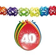 Verjaardag feest 40 jaar geworden versieringen basic pakket bestaande uit ballonnen en feestslingers. In deze feest decoraties set: 2x gekleurde feestslingers van papier van 6 meter en 24x stuks…