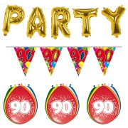 Verjaardag feestversiering 90 jaar PARTY letters en 16x ballonnen met 2x plastic vlaggetjes -