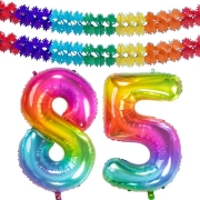 Folat folie ballonnen - Leeftijd cijfer 85 - glimmend multi-kleuren - 86 cm - en 2x slingers