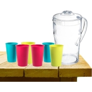 Forte Plastics Sapkan/schenkkan met deksel 2 liter transparant kunststof met 12x plastic gekleurde drinkglazen van 250 ML . Water/sap glazen in 3x verschillende kleuren 7 x 10 cm. Herbruikbaar.…