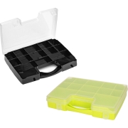 Forte Plastics opberg vakjes doos/sorteerbox set van 4x stuks. 13-vaks kunststof opbergboxen. Formaat: 27 x 20 x 3 cm. In de kleuren zwart en groen. 2x stuks per kleur. Deze handige opberg vakjes…