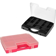 Forte Plastics opberg vakjes doos/sorteerbox set van 4x stuks. 13-vaks kunststof opbergboxen. Formaat: 27 x 20 x 3 cm. In de kleuren zwart en roze. 2x stuks per kleur. Deze handige opberg vakjes…