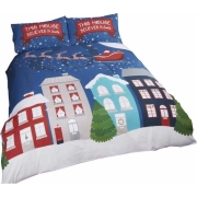 Prachtig glow in the dark dekbedovertrek. Huisjes met daarboven in de lucht de arreslee met Santa voortgetrokken door 4 rendieren. Op het kussensloop de tekst This House believes in Santa. Ja wie…