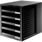 Ladenkastje van antistatisch polystyrol. Zwarte ombouw met 4 gesloten laden. Voor het bewaren, verzamelen of sorteren van al uw bescheiden die u op uw werkplek onder handbereik wilt hebben. Laden…
