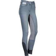 Rijbroek van stretch denim materiaal, rondgenaaid zitvlak met kunstlederen inzet, twee kontzakken met glitter print en borduursel, print in de voorzak, glitter print in voorzak, lycra flex legs…