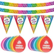 Verjaardag versiering pakket in Happy Birthday thema. Dit feestartikelen pakket bestaat uit 20x gekleurde ballonnen met print, 1x plastic thema vlaggetjes 5 meter en 2x papieren gekleurde…
