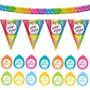 Verjaardag versiering pakket in Happy Birthday thema. Dit feestartikelen pakket bestaat uit 18x gekleurde ballonnen met print, 1x plastic thema vlaggetjes 5 meter en 2x papieren gekleurde…