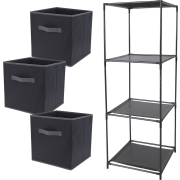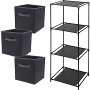 Kastmandjes/opberg manden in de kleur zwart, set van 3x stuks. De mandjes zijn 30 x 30 x 30 cm met 29 Liter inhoud. Het lichtgewicht metalen opslag rekje heeft afmetingen 34 x 34 x 98 cm en zet u…