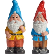 Tuinkabouter beeldjes set van 2x blauw/rood. De tuindwergen hebben een tuingereedschap voorwerp in handen. Formaat is ongeveer 38 cm hoog. Materiaal: keramiek. Tuindecoratie kabouters voor buiten…
