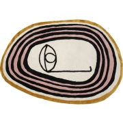Dit dikke katoenen vloerkleed is een blikvanger met het zwarte oog in het midden op een witte achtergrond, geaccentueerd door roze en zwarte cirkels omringd door een gele buitenrand…