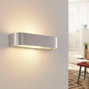 Afgeronde aluminium wandlamp Nika met fitting E14 De aluminium afdekking, die het hoofdbestanddeel vormt van wandlamp Nika, heeft een licht afgeronde vorm, waardoor ze er bijzonder harmonieus uitziet…